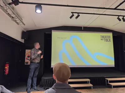Namens Theater met Tolk (TmT) werd daarna een presentatie gegeven over het ontstaan van TmT, de eerste uitdagingen en de groei naar een breder aanbod aan toegankelijke voorstellingen. Ook werden enkele mooie voorbeelden gedeeld. De tijd was beperkt (10–15 minuten), maar het verhaal werd in vogelvlucht duidelijk overgebracht.