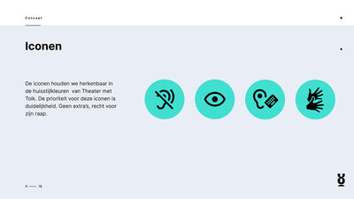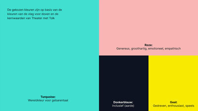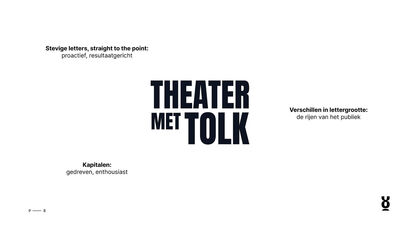 Om de stijl een eigen en unieke draai te geven, is de gebarentaal in vormen verwerkt. Door handen abstract als uitvergrote lijnen te gebruiken, is een stijl gemaakt, die écht eigen voelt. De gekozen kleuren zijn op basis van de kleuren van de internationale vlag voor doven en de kernwaarden van Theater met Tolk.